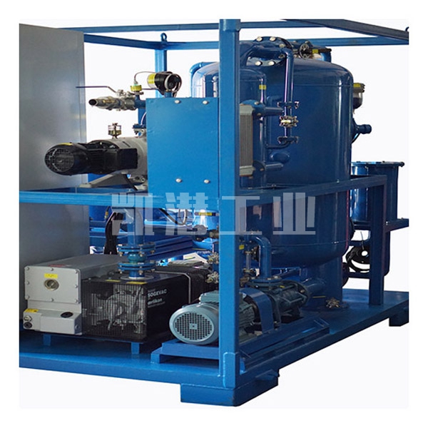 待處理的油經(jīng)過(guò)一級(jí)粗濾器后進(jìn)入加熱器進(jìn)行加熱,加熱后的油經(jīng)過(guò)第二級(jí)過(guò)濾器到螺旋噴淋霧化系統(tǒng),變?yōu)榇至lF狀下落到反應(yīng)塔上進(jìn)入真空分離室,水分即開(kāi)始蒸發(fā),油霧在罐內(nèi)形成立體的多層面的蒸發(fā)結(jié)構(gòu),通過(guò)短時(shí)的循環(huán),便可達(dá)到凈化目的。經(jīng)過(guò)除雜質(zhì)、脫水、脫氣、除酸的油品在油泵的作用下經(jīng)過(guò)精密過(guò)濾器完成一個(gè)凈油工作循環(huán)。從真空分離室中分離出來(lái)的水蒸氣熱空氣進(jìn)入冷疑器,大部分水蒸氣凝結(jié)為水存入積水倉(cāng),排出機(jī)外,油中熱空氣經(jīng)冷卻后由真空泵排出。